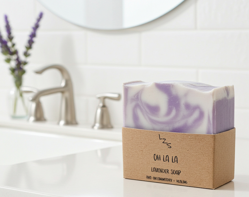 Soap contains: Olive Oil, Coconut Oil, Shea Butter, Mango Butter, Sunflower Oil.