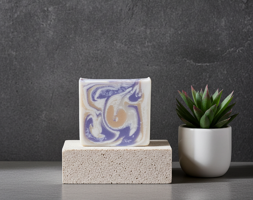 Lavender soap contains: Olive Oil, Coconut Oil, Shea Butter, Mango Butter, Sunflower Oil, Lavender + Bergamot Essential oils, Purple + Gold Mica, Rosemary extract.