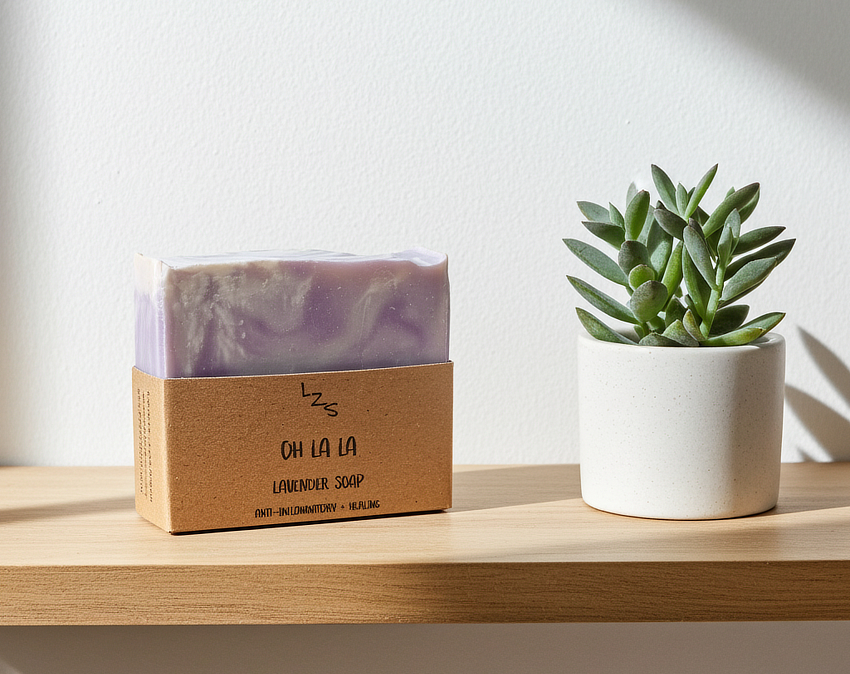 Soap contains: Olive Oil, Coconut Oil, Shea Butter, Mango Butter, Sunflower Oil.