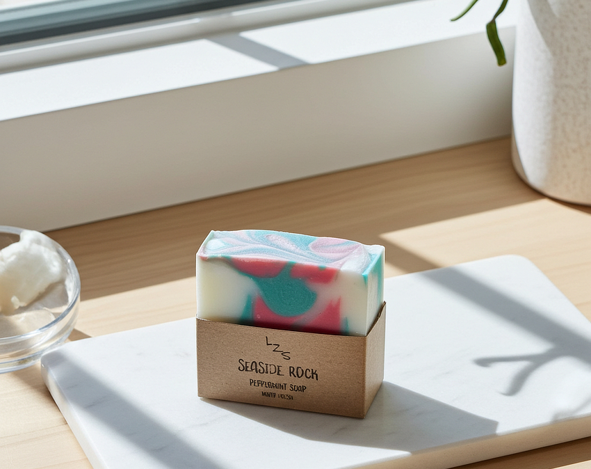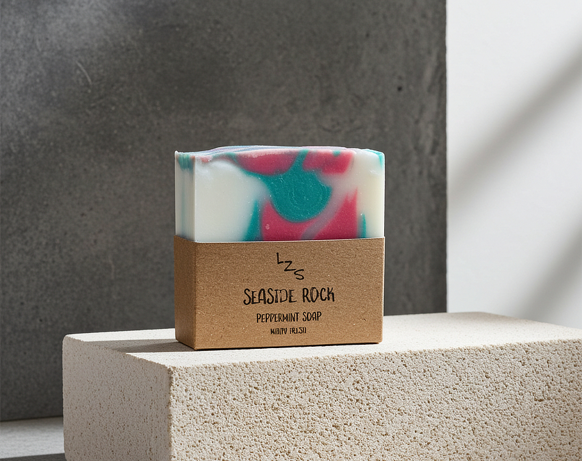Our Seaside Rock soap has classic red, green and white swirls and a minty fresh scent.