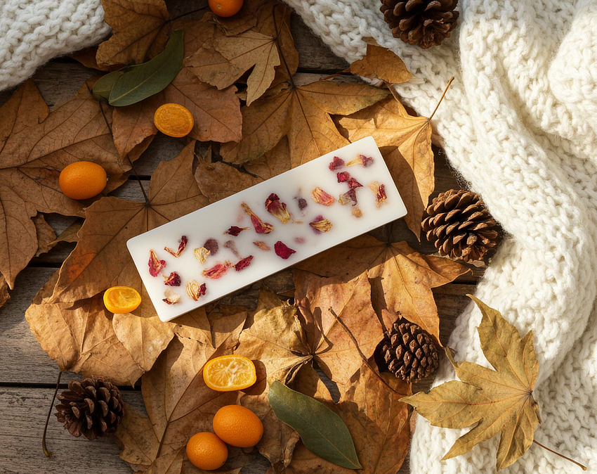 We change our wax brittle scents according to the season, and use similar scents to our candles and wax air fresheners – then we decorate them with botanicals to make the brittle look fabulous.